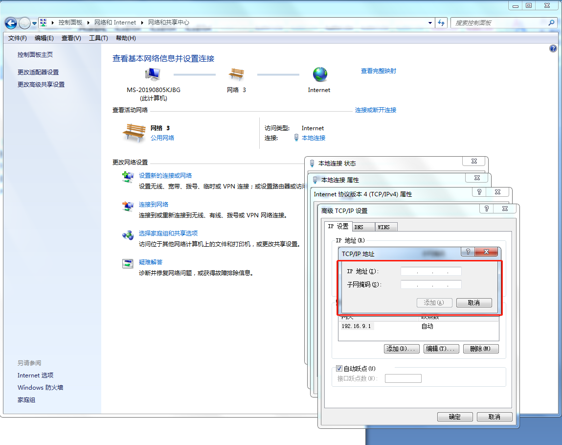 點擊“開始 - 控制面板 – 網(wǎng)絡(luò)和Internet - 網(wǎng)絡(luò)和共享中心 - 更改設(shè)備適配器”找到物理網(wǎng)卡,鼠標右擊“屬性”,選擇Internet 協(xié)議版本 4 (TCP/IPv4),點擊“屬性”,添加一個同網(wǎng)段IP。